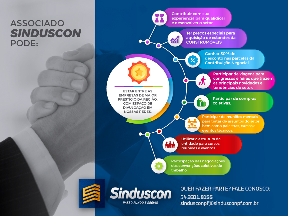 Associando-se ao SINDUSCON Passo Fundo sua empresa passa a contar com diversos serviços, além de participar efetivamente das atividades da entidade que está voltada para o interesse dos empresários do setor da construção civil e do mobiliário.